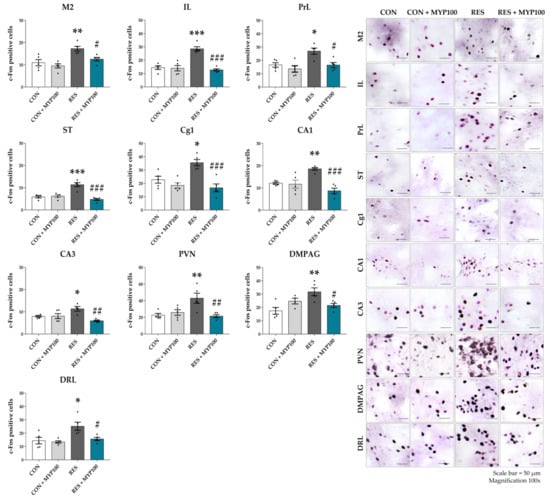 2.4. Changes of c-Fos Expression by MYP Treatment in the Brain