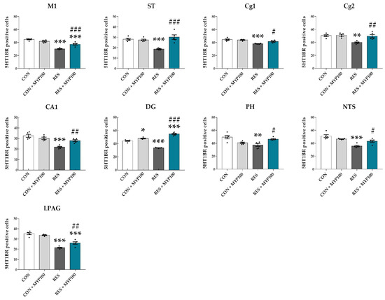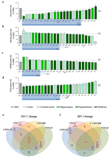 2.7. Analyze Hub Brain Regions According to the Changes of c-Fos, 5-HT1A/B Receptors, and TGF-β1 Expression by MYP Treatment