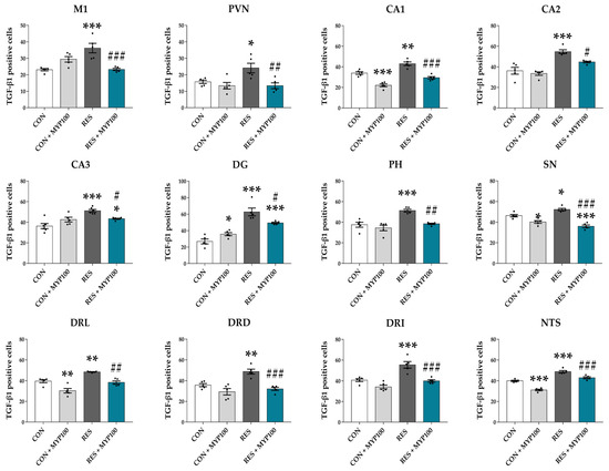 2.6. Reduction of TGF-β1 Expression by MYP Treatment in the Brain