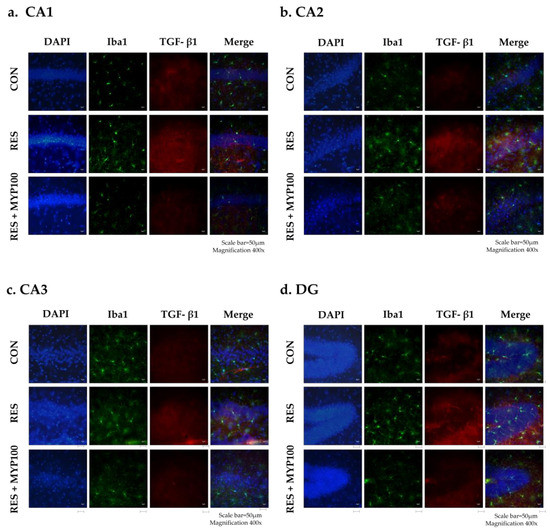 2.8. Reduction of TGF-β1 and Iba1 Expression by MYP Treatment in the Hippocampus