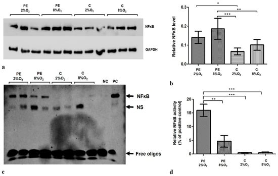 The differences in NFκB level and activity between HTR8/SVneo cells incubated in hypoxia and normoxia with medium containing 1% serum from preeclamptic (PE) or normotensive women (C). (a) Western blot membrane showing bands for NFκB and the control GAPDH protein; (b) NFκB level relative to GAPDH and Tubulin levels; the p-value was calculated by ANOVA with the Bonferroni post hoc test; * p < 0.05; ** p < 0.01; *** p < 0.001. Data are presented as mean ± SEM; (n = 3 experiments) (c) EMSA results. (d) EMSA results present as the relative NFκB activity calculated as percent of positive EMSA control; the p-value was calculated by the ANOVA with the Bonferroni post hoc test; ** p < 0.01; *** p < 0.001. Data are presented as mean and ± SEM; (n = 3 experiments). Abbreviations: PE 2% O2—hypoxia (2% O2), medium containing 1% serum from preeclamptic mothers; PE 8% O2—normoxia (8% O2), 1% serum from preeclamptic mothers; C 2% O2—hypoxia (2% O2), 1% serum from normotensive pregnant women; C 8% O2—normoxia (8% O2), 1% serum from normotensive pregnant women; NC—negative control; PC—positive control; NS—nonspecific band.