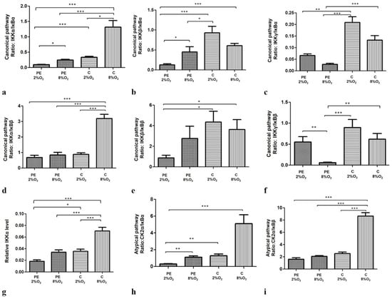 Moreover, our findings indicate that both oxygen tension and maternal serum, either separately or together, significantly modify the profiles of the canonical, non-canonical and atypical NFκB activation pathways. The efficiency profiles of the studied pathways were calculated based on the ratio of one of the activators to one of the inhibitors thus: IKKα/IĸBα, IKKα/IĸBβ, IKKβ/IĸBα, IKKβ/IĸBβ, IKKγ/IĸBα and IKKγ/IĸBβ for the canonical pathway and CK2α/IκBα and CK2α/IκBβ for the atypical pathway. The profile of the non-canonical pathway is only based on IKKα level, as this protein directly activates kappa B. Interestingly, all calculated ratios, except IKKγ/IĸBα and IKKγ/IĸBβ, were significant depleted for cells cultured in PE 2% O2 in comparison to these living in C 8% O2. As IKKγ cooperates with IKKα and IKKβ in the activation of NFĸB through the canonical pathway, and the calculated ratios for IKKα/IĸBα, IKKβ/IĸBα, IKKα/IĸBβ and IKKβ/IĸBβ were significantly lower for cells seeded in PE 2% O2 compared to C 8% O2, it is possible that the canonical pathway is downregulated in a preeclamptic environment. The results suggest that the canonical, non-canonical and atypical pathways do not play a significant role in the activation of NFκB in preeclampsia. The results of the calculated ratios for the three pathways are presented in Figure 2a–i.