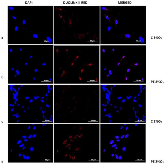 The presence of the Tumor Protein p53/Ribosomal protein S6 kinase alpha-1 (p53/RSK1) complex was found to be characteristic of normoxia (8% O2), irrespective of normotensive or preeclamptic serum (Figure 3a,b). Hypoxia appears to prevent the formation of p53/RSK1; however, while supplementation with serum from preeclamptic mothers may sustain its formation, serum from normotensive women results in a very weak p53/RSK1 reaction in 2% oxygen. (Figure 3c,d).