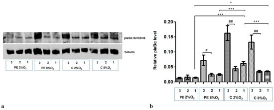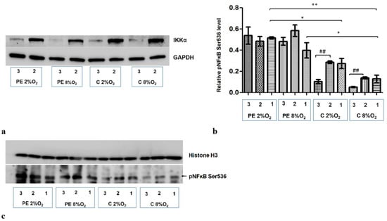 IKKγ protein expression was influenced by oxygen concentration. Cells living in normoxia demonstrated significantly lower levels of the studied protein than cells stimulated by the same serum in 2% O2 (i.e., IKKγ in PE 8% O2 < PE 2% O2 and in C 8% O2 < C 2% O2; p < 0.001 and p = 0.012, respectively). Under normoxia, maternal serum only had a significant effect at the 8% oxygen concentration: a significant lower level of IKKγ was observed in PE 8% O2 in comparison to C 8% O2 (p = 0.041) (Figure S1c).