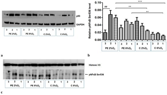 Western blot results. (a) inhibition of p53 by its targeted siRNA; Western blot results for the cytoplasmic fraction, (b) the differences in relative level of pNFĸB Ser536 to Histone H3 in nucleus of HTR8/SVneo cells. Cells were cultured for 96 h in hypoxic or normoxic conditions with medium containing 1% serum from preeclamptic or normotensive women. For the first 48 h, the cells were incubated only with medium containing the maternal serum. After 48 h and 72 h, the cell medium was supplemented with the following factors: none i.e., cells without siRNA (1), non-targeting siRNA (2) and targeted siRNA against mRNA coding for p53 (3). The relative level of pNFĸB Ser536 to Histone H3 in the nucleus was analyzed. Values are presented as mean ± SEM; (n = 3experiments). The difference in pNFĸB Ser536 level between cells stimulated by negative and targeted siRNA was calculated by the Student’s t-test; ## p < 0.01. The difference in pNFĸB Ser536 level between the four culture types (i.e., oxygen tension and serum type) which were not stimulated with siRNA were analyzed by ANOVA with the Bonferroni post hoc test; ** p < 0.01, *** p < 0.001. (c) Western blot results for nuclear fraction containing pNFĸB Ser536 and Histone H3, as a loading control.