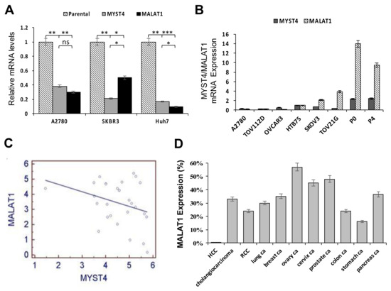 Relative expression levels between MYST4 and MALAT1, and levels of MALAT1 in various types of human cancer tissues: (A) Relative expression levels between MYST4 and MALAT1 were detected by an RT-qPCR after MYST4-knockdown in the A2780, Skbr3, and Huh7 cell lines (* p < 0.05; ** p < 0.01; *** p < 0.001). (B) Relative expression levels between MYST4 and MALAT1 were measured using an RT-qPCR in the A2780, TOV112D, OVCAR3, HTB75, SKOV3, and TOV21G ovarian cancer (OC) lines and the P0 and P4 endometrial carcinoma cell lines. mRNA expressions were normalized by the level in HTB75 cells. (C) Correlated expression levels between MYST4 and MALAT1 in 26 ovarian carcinoma tissue samples were calculated using Pearson’s correlation analysis, but no significant correlations (r = 0.3175, p = 0.0997) between the two genes were found. (D) MALAT1 expression among 11 types of human carcinomas, including hepatocellular (HCC), cholangiolar, renal cell (RCC), lung, breast, ovarian, cervical, prostatic, colon, stomach, and pancreatic carcinomas by in-situ hybridization on tissue microarrays. Ovarian cancer (OC) showed the highest frequency of MALAT1 expression.