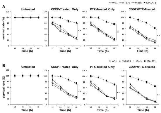 Cell viability was determined with a 3-(4,5-dimethylthiazol-2-yl)-2,5-diphenyltetrazolium bromide (MTT; ThermoFisher Scientific) assay, as previously described [44]. Briefly, cells were seeded into 96-well plates, cultured with complete medium for 16 h, and then treated with certain concentrations of CDDP (1.0 or 1.2 μM; Sigma–Aldrich), PTX (1.2 nM; Sigma–Aldrich), or their combination for various time points. Results of the 50% inhibitory concentration (IC50) titration of CDDP/PTX for HTB75, OVCAR3, and their MALAT1-overexpressing cells, are shown in Figure S4. Following removal of the supernatant, DMEM containing 5 mg/mL MTT was added and incubated for 4 h. The resulting formazan was dissolved in 1 mL isopropanol, and the absorbance at 570 nm was measured with a microplate reader (Bio-Rad Laboratories, Hercules, CA, USA). The number of viable cells was proportional to the absorbance, and cell viability was presented as a percentage of the dimethyl sulfoxide (DMSO) control (untreated).