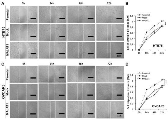 Overexpression of MALAT1 enhanced HTB75 and OVCAR3 cell migration: Representative images of cell migration and their relative migration distances in (A,B) HTB75 and (C,D) OVCAR3 cell lines following transduced overexpression of MALAT1. Both MALAT1-overexpressing HTB75 and OVCAR3 cells showed significantly increased migration distances after a wound scratch at 24, 48, and 72 h compared to the mock-transduced (Mock) and non-transduced (Parental) controls (*** p < 0.001). The scale bar is 1 cm. Representative experiments were repeated at least three times.