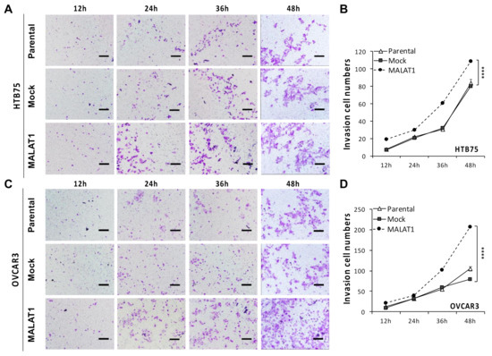 Overexpression of MALAT1 increased the in vitro invasive capacity: Compared to mock-transduced (Mock) and non-transduced (Parental) cells, MALAT1-overexpressing (MALAT1) HTB75 (A,B) and OVCAR3 (C,D) cells showed significant increases in invasive cell numbers in the transwell invasive assay (**** p < 0.0001). Crystal violet-stained cells were captured after 12, 24, 36, and 48 h of incubation, and the scale bar shown is 1 cm (A,C). Line figures reveal the invasion cell numbers (B,D). Data are expressed as the mean ± SD. Similar results were obtained from three independent experiments.
