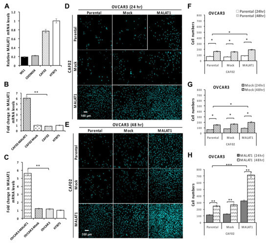 In the TME, stromal cells such as CAFs are known to be essential to cancer development and progression. To further investigate the role of MALAT1 fibroblasts in OEC cell invasion, the effect of MALAT1 overexpression in CFA02 ovarian CAFs was investigated. Original mRNA levels of MALAT1 in three fibroblast cell lines were measured, with HTB75 cells serving as the expression control (Figure 5A). Compared to individual mock-transduction (CAF02-Mock and OVCAR3-Mock) and parental cells, MALAT1 upregulation in CAF02 (CAF02-MALAT1) and OVCAR3 cells (OVCAR3-MALAT1) showed significantly higher mRNA levels according to an RT-qPCR analysis (Figure 5B,C, * p < 0.05 and ** p < 0.01, respectively). Following MALAT1 overexpression, the ability of CAF02 cells to promote OVCAR3 invasion was elucidated using an in vitro transwell invasion assay. Compared to parental CAF02 and OVCAR3 cells, the individual upregulation of MALAT1 led to significant increases (Figure 5D–H; * p < 0.05 and ** p < 0.01, respectively) in the transwell invasive ability of OVCAR3 cells, which indicated that the invasive ability of OVCAR3 cells was closely associated with MALAT1-expressing CAFs and/or EOCs. Interestingly, a dramatically increased OVCAR3 invasive ability was observed with the concurrent overexpression of MALAT1 in both CAF02 fibroblasts and OVCAR3 EOC cells during the 24- and 48-h incubation periods (Figure 5D–H; all ** p < 0.01) compared to that of the mock-transduction and parental control groups. These results suggested that MALAT1 is not only important in EOC cells, but is also an important factor in CAFs, particularly in the TME regulating of the invasiveness of EOC cells.