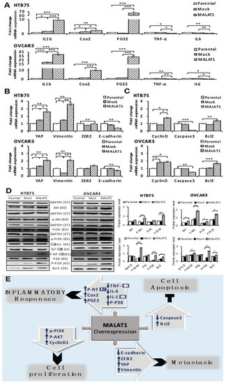 MALAT1 overexpression mediated epithelial ovarian cancer (EOC) progression through enhancing inflammation, cell proliferation, and metastasis, while reducing cell apoptosis: A schematic in vitro model for the overexpression of MALAT1 regulating different functional molecules with similar significance levels in both (A–C) HTB75 and (A–C) OVCAR3 cells through upregulation of IL-1β (*** p < 0.001), Cox2 (** p < 0.01 and *** p < 0.001, respectively), PGE2 (***p < 0.001), YAP (** p < 0.01), Vimentin (** p < 0.01), Cyclin D1 (* p < 0.05), Bcl2 (** p < 0.01 and *** p < 0.001, respectively), and zinc finger E-box-binding 2 (ZEB2) (** p < 0.01 and * p < 0.05, respectively), and downregulation of tumor necrosis factor (TNF)-α (* p < 0.05), interleukin (IL)-6 (** p < 0.01), and E-cadherin (** p < 0.01) mRNA levels by a real-time PCR analysis. Moreover, (D) protein levels of phosphorylated (p)-phosphatidylinositol 3-kinase (PI3K) (*** p < 0.001 and * p < 0.05, respectively), p-Akt (** p < 0.01), p-P38 (*** p < 0.001), p-NFκB (*** p < 0.001 and * p < 0.05, respectively), and Bcl2 (* p < 0.05) were also significantly upregulated in MALAT1-overexpressing HTB75 and OVCAR3 cells by a Western blot analysis. (E) Functional mechanisms of MALAT1 overexpression in EOC samples include promotion of inflammation, cell proliferation, and metastasis, combined with inhibition of cellular apoptosis, thereby triggering tumor progression in EOCs. Data shown are the mean ± SD of three independent experiments.
