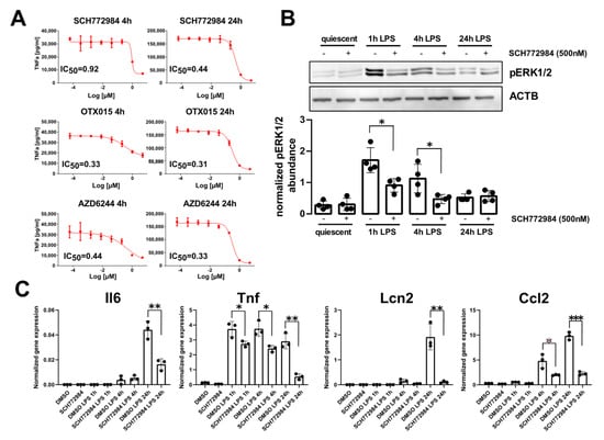 SCH772984 significantly attenuates LPS-induced TNFa production and inflammatory genes expression in the RAW 264.7 cell line. (A) IC50 values of TNFa production inhibition for the most effective drugs at 4 h and 24 h post-LPS challenge. (B) Representative Western blot (upper panel) showing the levels of ERK1/2 phosphorylation following SCH772984 treatment upon LPS time course challenge. The graph (lower panel) shows the averaged pERK1/2 abundance normalized to Actb by densitometry analysis of Western blotting bands. Values derived from four independent experiments and their means (+/− SD) are presented. * p ≤ 0.05, as determined by unpaired t-test. (C) qPCR results showing the mRNA expression of inflammatory genes following SCH772984 treatment upon LPS time course. Data from three independent experiments and their means and +/− SD are presented. * p ≤ 0.05, ** p < 0.01, *** p < 0.001 as determined by unpaired t-test.