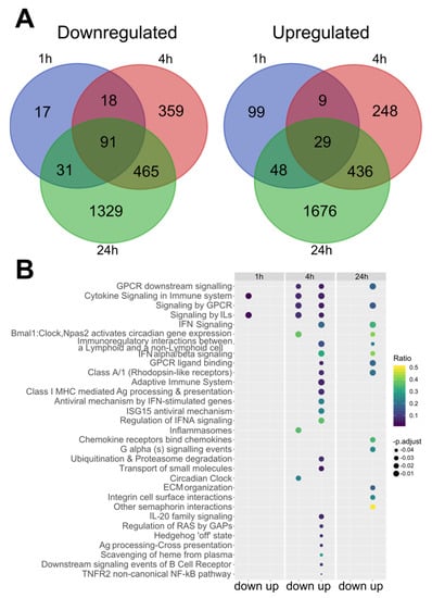 SCH772984 changes RAW 264.7 cells transcriptomes by altering gene expression pathways related to immune system pathways upon LPS challenge. (A) Venn diagram illustrating the number of up and downregulated DEGs (adj. p. value < 0.05) and Reactome pathways (B) altered upon SCH772984 treatment during the LPS challenge time points. IL—interleukin; IFN—interferon; Ag—antigen; ECM—extracellular matrix.
