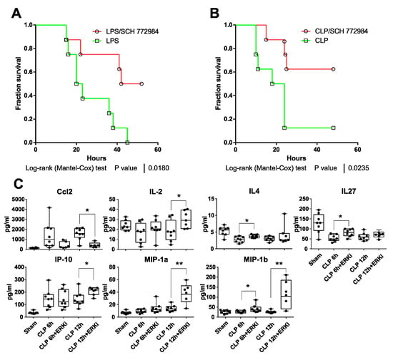SCH772984 improves survival in mouse models of sepsis and reduces plasma levels of Ccl2/Mcp1 chemokine. Kaplan–Meier survival curves of (A) LPS-treated C57BL/6W mice (20 mg/kg, i.p., n = 8 per group) or mice subjected to cecal ligation puncture (CLP) procedure (B) that were both injected i.p. with solvent control or 10 mg/kg of SCH772984 2 h after LPS administration/CLP procedure. (C) Plasma levels of indicated cytokines were measured with the 26-Plex Mouse ProcartaPlex immunoassay in CLP, SCH772984 (ERKi)-treated CLP, and sham-operated animals (n ≥ 6) at 6 and 12 h endpoint. ** p < 0.01, * p < 0.05 as determined by unpaired t-test. Only seven cytokines with significant alternations in plasma levels following SCH772984 are shown.