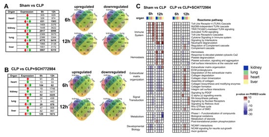 SCH772984 downregulates transcripts associated with the immune response and hemostasis in kidney and liver tissues, and positively regulates ECM and retinoic acid pathways in the lungs and liver, respectively, in a CLP-induced mouse model of sepsis. The numbers of differentially expressed genes (adj. p-value < 0.05) across the organs and two time points in the sham vs. CLP groups (A) and upon SCH772984 (10 mg/kg) treatment (B). Red and green arrows indicate up- and downregulated genes, respectively. Venn diagrams show the overlapping numbers of DEGs for organs at a given time point post-CLP for up-and downregulated genes. (C) Significantly altered (adj. p-value < 0.05) recurrent Reactome terms across the organs and time points in the sham vs. CLP and the CLP vs. CLP+ SCH772984 groups. The Reactome pathways with a differential gene ratio higher than 10% and recurrently altered in more than two types of samples are shown. The p-value is shown on the PHRED scale and is reversed for downregulated pathways.