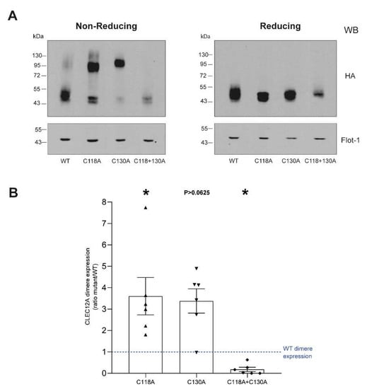 CLEC12A oligomerisation is dependent on C118 and C130. (A) Oligomerisation of WT CLEC12A and CLEC12A cysteine mutants was analyzed by Western blot of transiently transfected HEK-293T cells with the anti-HA and flotillin-1 antibody (loading control) under non-reducing (left blot) and reducing (right blot) conditions. (B) Densitometry analysis of CLEC12A oligomer expression in the non-reducing gel is shown as the following ratios: (CLEC12A mutant dimer/CLEC12A mutant dimer + monomer)/(CLEC12A WT dimer/CLEC12A WT dimer + monomer)’. The dotted line represents the CLEC12A WT ratio set to 1 for comparison with the CLEC12A mutants. Data in (A) are representative of six and three independent experiments for the non-reducing and reducing immunoblots, respectively. Statistical analysis: One sample Wilcoxon test * p < 0.05.