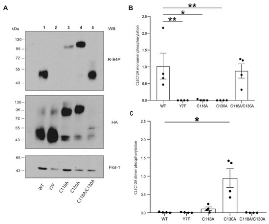 Inhibitory receptor signaling is initiated by receptor clustering resulting in ITIM phosphorylation []. The role of cysteine residues in the stalk region of CLEC12A on ITIM phosphorylation was examined in pervanadate-treated cells. Immunoblot analysis with an anti-phospho CLEC12A antibody showed that inhibition of protein tyrosine phosphatases with pervanadate resulted in CLEC12A WT phosphorylation in HEK-293T transfected cells (Figure 3A, lane 1). CLEC12A ITIM phosphorylation was detected with an in-house generated, anti-phospho CLEC12A ITIM antibody (R-94P) described in Paré et al. []. Phosphorylation was ITIM-specific as mutating this motif’s tyrosine to a phenylalanine (Y7F) abolished CLEC12A phosphorylation (Figure 3A, lane 2). The double cysteine CLEC12A mutant was also phosphorylated (Figure 3A, lane 5) indicative that C118 and C130 are not required for CLEC12A monomer phosphorylation in pervanadate-treated cells. In line with this observation, mutation of C118 or C130 did not abolish CLEC12A ITIM phosphorylation as R-94P bound both these CLEC12A mutants (Figure 3A, lane 3 and 4). Phosphorylation was, however, predominantly observed in C118A and C130A dimers. Moreover, there was a strong tendency for the level of phosphorylation to be superior for the C130A dimers than the C118A dimers but this difference did not reach significance.