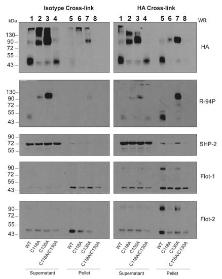 We and others previously reported the recruitment of SHP-2 by CLEC12A after phosphorylation induced by antibody-mediated clustering or treatment with pervanadate [,]. In contrast, SHP-2 was not detected in the pellet fraction in cells expressing the double cysteine mutant (Figure 4, lane 8 of the right, SHP-2 blot). A similar observation was made for C118A, highly likely due to the low levels of cell-surface expression of this mutant receptor. As for C130A, it recruits SHP-2 to the pellet fraction after antibody-induced cross-linking similar to CLEC12A WT (Figure 4, compare lanes 5 and 7 of the right, SHP-2 blot). Together, these results indicate that the presence of the C118 residue is essential for SHP-2 recruitment by CLEC12A.