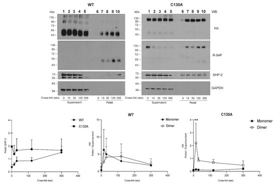 Signaling reactions are dynamic over time. As C130A was able to translocate to the insoluble fraction of the cell lysate to the same extent as CLEC12A WT, we examined the possibility that mutating C130 influences the kinetics of CLE12A translocation, phosphorylation, and/or SHP-2 recruitment. A time course experiment was performed to follow these molecular events by Western blot analysis at the indicated time points. We not only confirmed that C130A dimers translocated to the pellet after CLEC12A cross-linking, but also that this phenomenon occurred with faster kinetics than for CLEC12A WT monomers (Figure 5, compare lanes 1–5 to 6–10 in C130A, HA gel). The proportion of C130A dimers in the pellet at 15 s post-cross-linking was two-fold higher than CLEC12A WT monomers and already at its peak of recruitment to the pellet compared to 120 s for CLEC12A WT. Moreover, SHP-2 recruitment to the insoluble NP40 pellet is also accelerated in cells expressing C130A dimers as it is at its highest level a 15 s after cross-linking compared to 300 s for CLEC12A WT monomers (Figure 5, compare lanes 6–10 in left and right anti-SHP-2 blots). Together, these data indicate that C130A is a gain of function mutation.