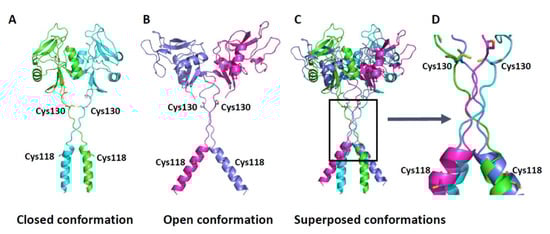 3D models of CLEC12A in different conformations. (A) CLEC12A in closed conformation with Cys118 and Cys130 that could form disulfide bridge between two monomer. (B) CLEC12A in open conformation with Cys118 and Cys130 that are predicted to not form disulfide bridge. (C) Superposition of closed and open conformation. (D) Close-up in the region containing Cys118 and Cys130. 3D models images were generated using PyMOL (http://www.pymol.org) (accessed on 1 February 2016).