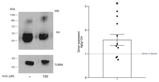 Disulfide bonds form through an oxidation reaction involving cysteine residues [,]. We tested the hypothesis that oxidation would enhance the formation of CLEC12A oligomers by incubating cells transiently transfected with CLEC12A WT with H2O2 at a physiological level of 100 µM []. The ratio of CLEC12A WT oligomers to monomers formed in peroxide-treated HEK-293T cells transiently transfected with CLEC12A WT was significantly higher compared to cells incubated in buffer (Figure 7). These data suggest that CLEC12A stalk cysteines regulate CLEC12A oligomerisation, in part, by sensing the oxidative state of the environment.
