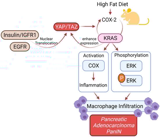 Many factors are involved in the development of fully invasive PDAC. These include KRAS mutations in addition to many others, metabolic and environmental stressors, and obesity [71]. Changes in the TME, including gut microbiota, inflammation, intestinal peptides, and insulin resistance, which are associated with obesity, can enhance the activation of KRAS. A high-fat diet (HFD) can initiate the transformation of normal pancreatic cells into PanIN lesions through stimulation of oncogenic KRAS [72]. Previous studies have reported that HFD consumption helps KRAS to recruit more inflammatory mediators to the pancreas enhancing PanIN formation [72]. This KRAS activation via HFD leads to downstream activation of COX2 (positive feed-forward loop maintaining KRAS activity), phospho-ERK, and infiltration of macrophages into the stroma, which, as a result, increases inflammation in acinar cells, thus helping in PanIN formation (Figure 3) [72]. Additionally, it has been identified that YAP/TAZ transcriptional co-activators represent a major element in this amplification loop. Importantly, YAP nuclear localization is stimulated by GPCRs, EGFR, and insulin/IGF-1 receptor signaling, whereas YAP expression is enhanced by KRAS activation. YAP, in turn, leads to PDAC survival through BIRC5 and the evasion of immune surveillance through CXCL5 [71].