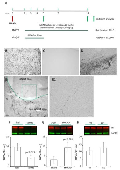 (A) Brain tissue sections and brain lysates from regions of interest were obtained from male Wistar rats subjected to transient or permanent occlusion of the middle cerebral artery (tMCAO/pMCAO) [,]. At the experimental endpoints (study I: 14 days; study II: 5 days) brains were either analyzed for dopaminergic innervation (study II), the Nogo A pathway, the number oligodendrocyte precursor cells and Growth-Associated Protein 43 (GAP 43) protein levels (study I). (B) Dopaminergic innervation in the peri-infarct area five days following pMCAO and (C) in the cortex of a sham-operated rat. (D) The ipsilateral Substantia nigra of the same animal shown in (C) as positive control for tyrosine hydroxylase (TH). Scale bars (B–D)—100 µm. (E) Higher magnification of the proximal peri-infarct/infarct core border zone. The infarct border is delineated as a green dashed line. CI: capsula interna, scale bar: 50 µm. (E1) Higher magnification of the insert of an individual TH positive branch shown in (E). Scale bar: 20 µm. (F) TH levels (red, StarbrightBlue 700) in the peri-infarct area (n = 8) compared to the homotypic region of the contralateral cortex (n = 8), 14 days after tMCAO in rats (G) TH levels in the somatosensory/motor cortex of sham operated rats (n = 5) compared with rats subjected to tMCAO (n = 6). (H) Levels of TH in the peri-infarct area of saline (vehicle; n = 8) and levodopa (LD 20 mg/kg; n = 8) treated rats, 14 days after tMCAO. Levels of TH have been normalized against glyceraldehyde 3-phosphate dehydrogenase (GAPDH, green, rhodamine). Statistical analysis was performed using Student’s t-test. p value < 0.05 was considered significant and differences are shown in respective figures.