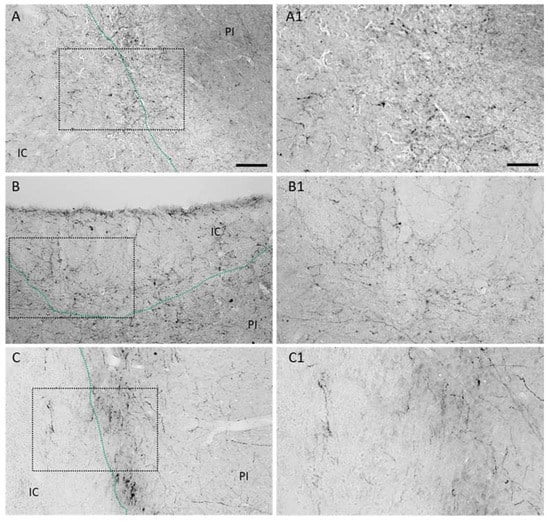 Dopaminergic innervation in rodent models of experimental stroke. Representative micrographs illustrating increased number of tyrosine hydroxylase positive neuronal branches in the ischemic core and peri-infarct of (A) rats 21 days after permanent focal stroke induced by photothrombosis (PT), (B) 14 days after mice have been subjected to PT or (C) to transient MCAO. Higher magnifications of depicted rectangles are shown in (A1), (B1) and (C1), respectively. Scale bars: A, B and C 100 µm, A1, B1 and C1 50 µm.