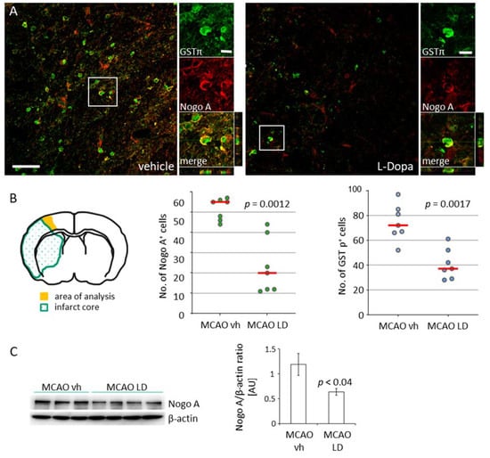 Downregulation of Nogo A by treatment with levodopa. (A) Co-staining for Nogo A (red, Cy3) and glutathione-S-transferase π (GST π, green, AF488) in the peri-infarct area of rats treated either with saline (vehicle) or levodopa (LD 20 mg/kg) 14 days after tMCAO; scale bars: low magnification 50 µm, high magnification 10 µm. (B) Illustration of the peri-infarct area (yellow) used for analyses and the number of Nogo A and GST π positive cells (n = 7, each experimental group) in this region. Statistical analysis was performed by the Mann–Whitney test. (C) Levels of Nogo A in the peri-infarct area in rats treated either with vehicle (n = 7) or levodopa (n = 8) and semi-quantitative analysis of bands after normalization against beta-actin. Statistical analysis was performed by the Student’s t-test. p Value < 0.05 was considered significant and differences are shown in respective figures.