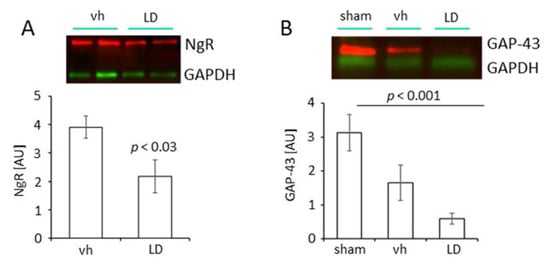 Together, the inhibition of the Nogo A pathway by desensitizing neurons to axonal growth inhibitors by downregulation of the NgR1 as well as scavenging Nogo A have beneficial effects on the recovery of lost function after experimental stroke []. Here, we show that rats subjected to tMCAO and treated with LD showed a significant downregulation of NgR1 and Nogo A; these cohorts showed a significant recovery without affecting the lesion size as we have reported previously [,]. Therefore, enhancing dopaminergic signaling following stroke may be a promising adjuvant to treatments aiming at reducing the levels of myelin-associated inhibitors.