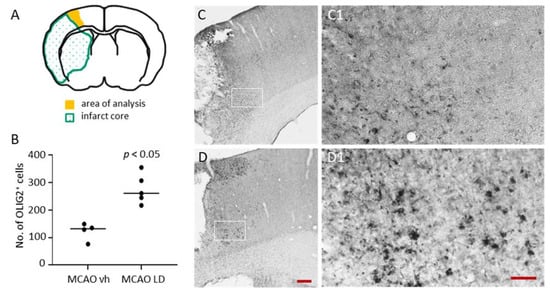 The role of the dopaminergic system on oligodendrogenesis is unknown, in particular following an acquired brain injury such as ischemic stroke. Substantial tissue loss due to primary and secondary cell death results in the disruption of neuronal connections and circuitries and is accompanied by myelinating cells. Structural changes of neurons in healthy tissue in the lesioned hemisphere are well documented [], hence, it is not exactly known if and how myelinating cells regenerate or are replaced. In rats submitted to tMCAO, we found OLIG-2 positive oligodendrocyte precursor cells around the infarct core 14 days after the insult (Figure 5A,B). Cells mainly accumulated in layers 2 and 3 and layers 5 and 6 (Figure 5C,D) with higher magnifications in Figure 5C1,D1 showing a glia-like stellate morphology. The quantification of cells revealed a significant higher number of OLIG-2 positive cells in rats treated with LD (median 261 cells, Q1 245 cells, Q3 307 cells) compared to saline-treated vehicle animals (median 132 cells, Q1 116 cells, Q3 138 cells) (Figure 5B). These numbers show a clear effect in the levodopa-treated rats.