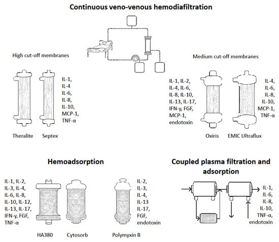 - Harm, S.; Schildböck, C.; Hartmann, J. Cytokine removal in extracorporeal blood purification: An in vitro study. Blood Purif. 2020, 49, 33–43. [Google Scholar] [CrossRef] [PubMed]