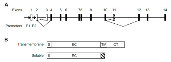 Structure of the human IL5RA gene, its alternative transcripts and protein isoforms. (A) Alternative splicing choice resulting in the soluble or transmembrane splice variant is indicated by dashed lines. Open boxes represent untranslated exons and black boxes represent translated exons. Exon 11 (striped) is soluble-specific while exons 12–14 are transmembrane-specific. Promoters P1 and P2 are located upstream of exons 1 and 2 as indicated by arrowheads. (B) IL-5Rα exists in two protein isoforms. The soluble isoform lacks transmembrane and cytoplasmic domains and instead has a soluble isoform-specific domain (striped) encoded by exon 11. S: signal peptide. EC: extracellular domain; TM: transmembrane domain; CT: cytoplasmic tail.