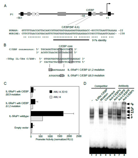 In addition to GATA-1 sites, consensus C/EBP binding sites were also predicted in the IL5RA P1 promoter. Among these, one C/EBP site situated at −58 bp of the P1 promoter is conserved between the human and putative murine promoter sequences (Figure 6A), providing greater confidence for the presence of a functional binding site at this location. To test if C/EBP functionally binds at this location, two promoter reporter gene constructs each containing a specific two-nucleotide mutation were generated in this putative C/EBP binding site using site-directed mutagenesis (Figure 6B). When analyzed by transfection into AML14 and AML14.3D10 cells, both mutations (Δ1,2 and Δ8,9) completely abolished P1 promoter activity as compared to the WT promoter, indicating that this sequence is likely a functional C/EBP binding site (Figure 6C).
