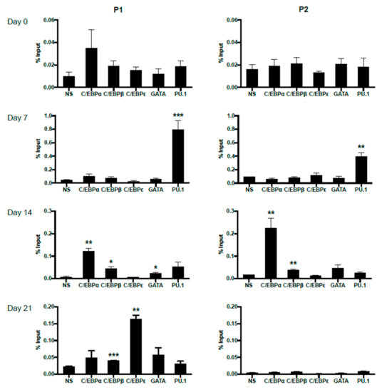 In order to trace the potentially changing occupancies of important transcription factors on P1 and P2 promoters during primary eosinophil differentiation from CD34+ hematopoietic stem cells, we performed ChIP analyses on eosinophil progenitors at days 0, 7, 14 and 21 of IL-5-induced differentiation (Figure 7). For both P1 and P2, no statistically significant binding was observed for the examined transcription factors at day 0, likely due to lack of IL-5Rα expression pre-commitment to the eosinophil lineage. As differentiation proceeded, P1 was observed to be bound first by PU.1 at day 7, then C/EBPα, C/EBPβ, and GATA-1 at day 14. On day 21, P1 was bound by C/EBPβ and C/EBPε. P2 was observed to be bound by PU.1 at day 7, then C/EBPα and C/EBPβ at day 14. No statistically significant occupancy of P2 was observed at day 21, consistent with the attenuation of P2 promoter activity late in eosinophil differentiation (Figure 2C).