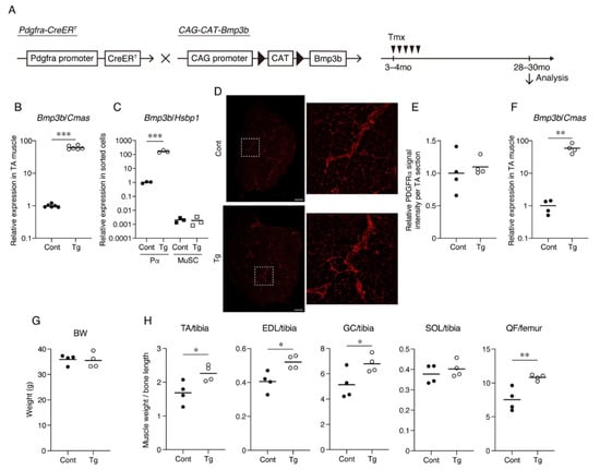 Pdgfra-CreER mice [] (stock #018280, The Jackson Laboratory, Bar Harbor, ME, USA) were purchased from The Jackson Laboratory. CAG-CAT-mBmp3b Tg mice have been previously described []. The genetically engineered mice were backcrossed with C57BL/6 mice at least six times. Three- to four-month-old mice were intraperitoneally injected with tamoxifen (Tmx, 4 mg) for five consecutive days to induce a recombination. Nine-week-old male C57BL/6 mice were used as the young mice.