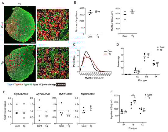 An analysis for the number, cross-sectional areas, and subtypes of the myofibers. (A) Tibialis anterior (TA) muscle sections of the Tg mice and littermate control mice (Cont, WT/CAG-CAT-Bmp3b) were stained with antibodies against MyHC I (blue), MyHC IIA (red), MyHC IIB (green), and laminin (white). The right panels are magnified views of the boxed regions in the left panels. (B) The number and cross-sectional areas (CSA) of the myofibers are shown. (C) The CSA distribution is displayed by a histogram. Note that the myofibers of the Tg mice are distributed in the larger region, while those of the control mice are distributed in the smaller region. (D) The percentage of each fiber type is shown. (E) The gene expression levels for Myh7 (type I), Myh2 (type IIA), Myh1 (type IIX), and Myh4 (type IIB) are shown. (F) The CSA of each fiber type was measured. The data are expressed as the means and individual data points; two-sided unpaired t-test. n = 4 mice per genotype. * p < 0.05. Scale bar: 300 μm (A).