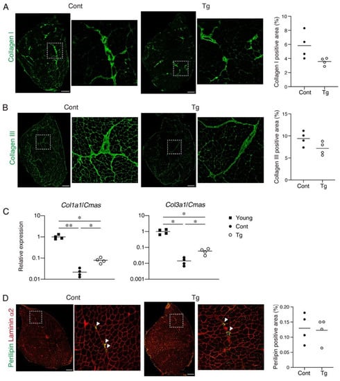 The extent of the fibrosis and fat infiltration in the skeletal muscle. (A) Tibialis anterior (TA) muscle sections of the Tg mice and littermate control mice (Cont, WT/CAG-CAT-Bmp3b) were stained with an antibody against collagen I (green). The right panels are magnified views of the boxed regions in the left panels. The percentage of the collagen I+ area is shown. (B) The TA muscle sections of the Tg mice and littermate control mice (Cont, WT/CAG-CAT-Bmp3b) were stained with an antibody against collagen III (green). The right panels are magnified views of the boxed regions in the left panels. The percentage of the collagen III+ area is shown. (C) The gene expression levels of Col1a1 and Col3a1 in the young, geriatric control (Cont, WT/CAG-CAT-Bmp3b) and the geriatric Tg mice are shown. (D) The TA muscle sections of the Tg mice and littermate control mice (Cont, WT/CAG-CAT-Bmp3b) were stained with antibodies against perilipin (green) and laminin α2 (red). The right panels are magnified views of the boxed regions in the left panels. The arrowheads indicate perilipin+ ectopic adipocytes located in the interstitial space. The percentage of the perilipin+ area is shown. The data are expressed as the means and individual data points; two-sided unpaired t-test (A,B,D). Brown–Forsythe and Welch ANOVA test (C). n = 4 mice. * p < 0.05 and ** p < 0.01. Scale bar: 300 μm.