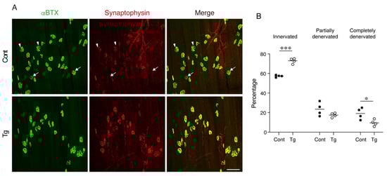 The degeneration of NMJ is a typical age-related deterioration of the skeletal muscle. We investigated the status of individual NMJ by a staining-based methodology that was shown to detect age-related NMJ degeneration efficiently []. In normal healthy NMJs, α-bungarotoxin-stained postsynaptic endplate regions are completely covered with synaptophysin-positive presynaptic nerve terminals. However, aging increases the ratio of degenerated NMJs, where the postsynaptic regions partially or completely lose their counterpart presynaptic nerve terminals. NMJ degeneration is prominent in fast-twitch extensor digitorum longus (EDL) but not in the slow-twitch soleus muscles of geriatric mice []. Therefore, we examined the NMJs in the EDL muscle by whole-mount immunofluorescence staining. In control geriatric mice, we frequently observed partially or completely denervated NMJs (Figure 4A,B). In contrast, the Tg mice showed less completely denervated NMJs and a trend for fewer partially denervated NMJs, resulting in more innervated NMJs compared to the control mice (Figure 4A,B). These results indicate that the transgenic expression of Bmp3b in mesenchymal progenitors preserves the NMJ from age-related deterioration and, thus, maintains the skeletal muscle health during aging.