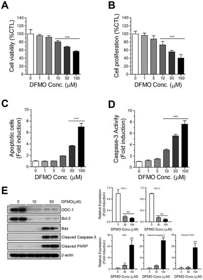 Inhibition of cell survival and induction of apoptotic cell death by DFMO in SKOV-3 cells. (A) SKOV-3 cells were cultured with varying concentrations of DFMO (from 0 to 100 μM) for 48 h, and cell viability was detected using the PrestoBlue assay. (B) Cell proliferation was determined by analyzing ATP content in DFMO-treated SKOV-3 cells using the CellTiter-Glo assay. (C) Flow cytometric analysis of Annexin V-FITC/PI-stained SKOV-3 cells treated with the control (0.1% DMSO) or 0–100 μM DFMO was used to determine the apoptotic rates of SKOV-3 cells under various concentrations of DFMO. (D) Caspase-3 activity in DFMO-treated SKOV-3 cells was measured using the Luciferase Assay (Caspase-Glo 3/7 Assay system). (E) Western blot and quantification analysis for the apoptotic proteins Bcl-2, Bcl-xL, Bax, cleaved caspase-3, and cleaved PARP in cells treated with DFMO. The controls were treated with 0.1% DMSO. Data are expressed as mean ± SD. ** p < 0.01, *** p < 0.001 compared with the controls.