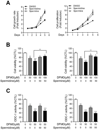 To confirm the effect of polyamines on the growth and proliferation of human ovarian cancer cells, we performed cell viability and proliferation analyses of SKOV-3 cells. The cells were incubated with 50 μM spermidine or spermine for 1–5 days, and then cell viability and proliferation were determined using the PrestoBlue or CellTiter-Glo assays, respectively. As shown in Figure 2A, spermidine or spermine significantly increased the viability and proliferation of SKOV-3 cells in a time-dependent manner. To verify whether exogenous polyamines inhibited the apoptotic effect of DFMO and ODC-1 activity, we performed a cell viability analysis and an ODC-1 luciferase analysis of DFMO/polyamine-treated SKOV-3 cells. Spermidine and spermine significantly decreased the apoptotic effect of DFMO in SKOV-3 cells (Figure 2B). However, polyamines did not affect the DFMO-induced inhibition of ODC-1 activity (Figure 2C). The results revealed that polyamines are associated with cancer survival and DFMO-induced cell death but not with ODC-1 activity.