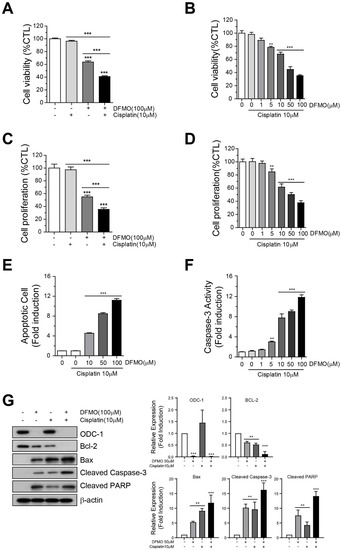 Effect of combination therapy using DFMO and cisplatin on SKOV-3 cell survival and apoptotic cell death. Cell viability was determined of cells treated with (A) 10 μM cisplatin, 100 μM DFMO, or (B) 10 μM cisplatin/0–100 μM DFMO for 48 h using the PrestoBlue assay and CellTiter-Glo assay. (C) Proliferation was determined in cells treated with (C) 10 μM cisplatin, 100 μM DFMO, or (D) 10 μM cisplatin/0–100 μM DFMO for 48 h. (E) Flow cytometric analysis of Annexin V-FITC/PI-stained SKOV-3 cells treated with 10 μM cisplatin/0–100 μM DFMO for 48 h was performed to determine the apoptotic rates of SKOV-3 cells under various concentrations of DFMO. (F) Caspase-3 activity in cisplatin/DFMO-treated SKOV-3 cells was measured using the Luciferase Assay (Caspase-Glo 3/7 Assay system). (G) Western blot and quantification analysis for the apoptotic proteins Bcl-2, Bcl-xL, Bax, cleaved caspase-3, and cleaved PARP in cells treated with DFMO. The controls were treated with 0.1% DMSO. Data are expressed as mean ± SD. ** p < 0.01, *** p < 0.001 compared with the controls.