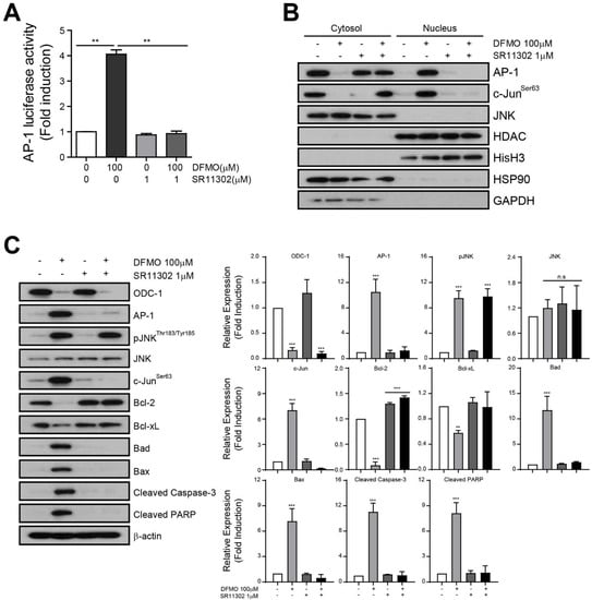 Induction of DFMO-induced apoptotic cell death through the regulation of AP-1 activity. The transfected cells were seeded in cell culture plates and treated with DFMO, SR11302, or DFMO/SR11302 for 48 h. (A) The AP-1 luciferase activity in the treated cells was determined using the Luciferase Assay System. (B) Western blot of organelle extracts (10 μg) was performed using the following markers: nucleus; HDAC, Histone H3/ cytosol: Hsp90, GAPDH. (C) Western blot analysis of the JNK signaling pathway detected JNK signaling proteins (phospho-JNK, JNK, phospho-cJun, AP-1), anti-apoptotic proteins (Bcl-2, Bcl-xL), and proapoptotic proteins (Bad, Bax cleaved caspase-3, cleaved PARP) in DFMO-, SR11302-, or DFMO/SR11302-treated cells, respectively. The controls were treated with 0.1% DMSO. Data are expressed as mean ± SD. * p < 0.05, ** p < 0.01, *** p < 0.001 compared with the controls.