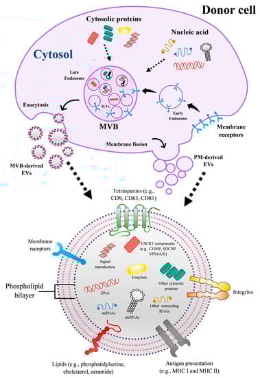 Schematic representation of origin and composition of EVs secreted by eukaryotic cell. PM-derived EVs originate directly from the cell membrane fission, whereas EVs of endosomal system originate from ILVs contained in cytosolic MVBs, which later fuse with the PM releasing the vesicles in the outer space. EVs can carry proteins, lipids, and nucleic acids. Some of the listed components represented in the figure may be enriched in some subtypes of EVs and not in others. For instance, ESCRTs components (e.g., CHMP, SDCBP, VPS4A/B) are highly enriched in MVB-derived EVs rather than PM-derived EVs. Abbreviations: CHMP, charged multivesicular body protein; ESCRT, endosomal sorting complex required for transport; ILVs, intraluminal vesicles; MVBs, multivesicular bodies; MHC, major histocompatibility complex; PM, plasma membrane; SDCBP, syndecan binding protein; VPS4A/B, vacuolar protein sorting-associated protein 4A/B.
