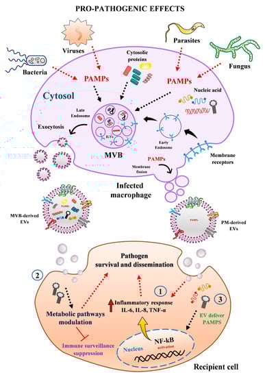 Pro-pathogenic effect mediated by EVs released from human macrophages. Macrophages infected with bacteria, virus, parasite, or fungi secreted heterogenous populations of EVs from different origin and sizes, which may favor pathogen growth and propagation through multiple mechanisms. For instance, (1) EVs from infected cells can trigger the secretion of pro-inflammatory cytokines (e.g., IL-6, IL-8, TNF-α) in recipient cells via activation of NF-kB pathway. (2) MΦ-EVs from infected cells can reprogram recipient cell metabolism pathways and modulated immune surveillance through transferring specific miRNAs. (3) EVs can be exploited by pathogens as alternative strategy to export microbial components (e.g., proteins, RNAs, miRNAs) to impair host defense and promote their infectivity and propagation. Abbreviations: MVBs, multivesicular bodies; PAMPs, pathogen-associated molecular patterns; PM, plasma membrane.