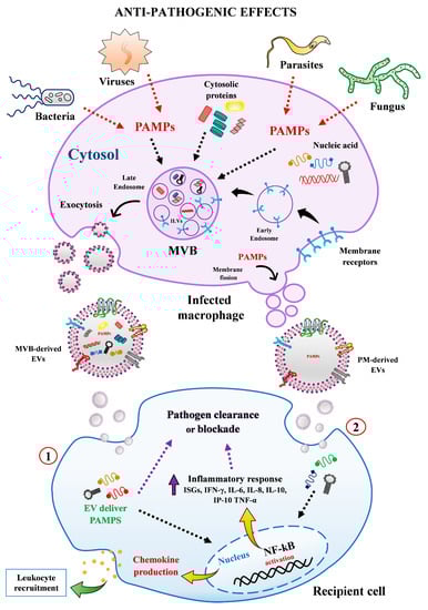 Anti-pathogenic effect mediated by EVs released from human macrophages. EVs secreted by infected macrophages may stimulate the clearance or blockade of pathogen growth in recipient cells by the following ways: (1) transporting PAMPs or pathogens antigens to enhance the expression of chemokines and recruitment of leukocytes to control the pathogen dissemination. (2) Transferring or stimulating proteins and molecules with anti-pathogenic effects, such as IFN-γ, IL-1β, IL-8, IL-6, IL-10, IP-10, TNF-α to diminish cell permissiveness to pathogen invasion. Abbreviations: MVBs, multivesicular bodies; PAMPs, pathogen-associated molecular patterns; PM, plasma membrane.
