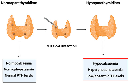Post-surgical Hypoparathyroidism. Figure created in BioRender.com, accessed on 21 September 2021.