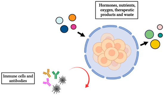 Illustration of the semipermeable membrane allowing the bidirectional diffusion of nutrients, oxygen, therapeutic products, and waste, while at the same time avoiding the entrance of immune cells and antibodies. Figure created in BioRender.com, accessed on 21 September 2021.