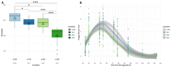 (A) Total broodsize during six days of egg-laying (n = 18–20 per condition (SC1: embryogenesis, SC2: early development, SC3: full development), Generalized Linear Model (GLM) and Tukey post-hoc with Bonferroni adjustment; ‘*’ p-value < 0.05; ‘***’ p-value < 0.001). (B) Egg laying rate (number of eggs laid per hour over six days) for each condition (smooth method is loess regression with 0.95 confidence interval) (significant differences were found between SC2-CTRL, SC3-CTRL, SC3-SC1, see text for p values).