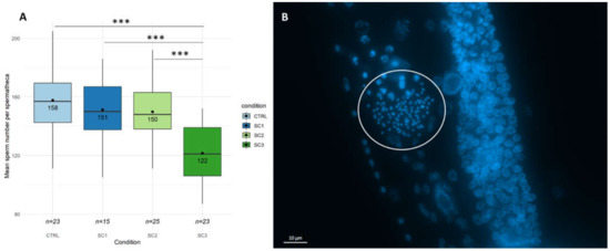 (A) Spermatid number per spermatheca (n = 15–25 per condition (SC1: embryogenesis, SC2: early development, SC3: full development), GLM, Tukey post-hoc with Bonferroni adjustment; ‘***’ p-value < 0.001). (B) DAPI-stained C. elegans gonad (Maximum intensity projection of Z-stacks image. DAPI staining appears in blue. White circle shows the spermatheca containing spermatid-stained nuclei counted with FIJI, on the right of the spermatheca is shown the distal gonad with proliferating germ cells).